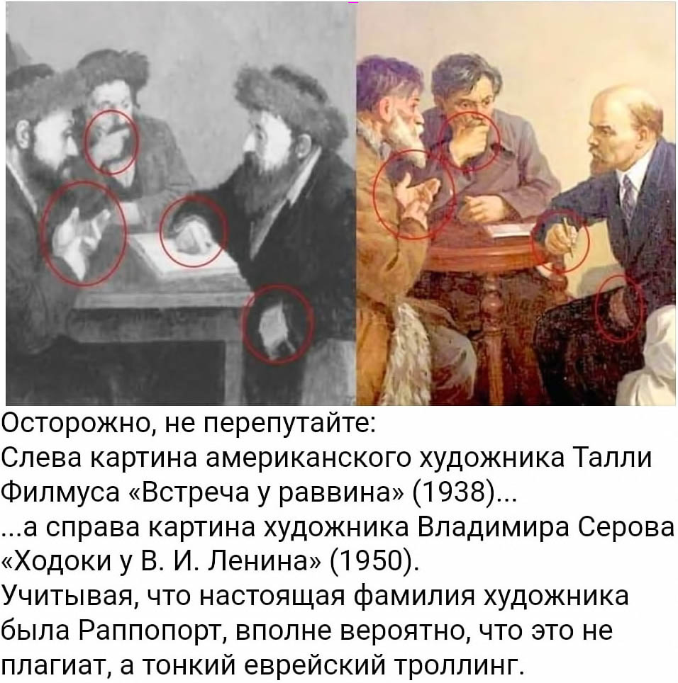 Оказывается, об этих картинах давно спорят Правда ли, что композиция картины «Ходоки у В. И. Ленина» позаимствована из работы «Встреча у раввина» американца Талли Филмуса?