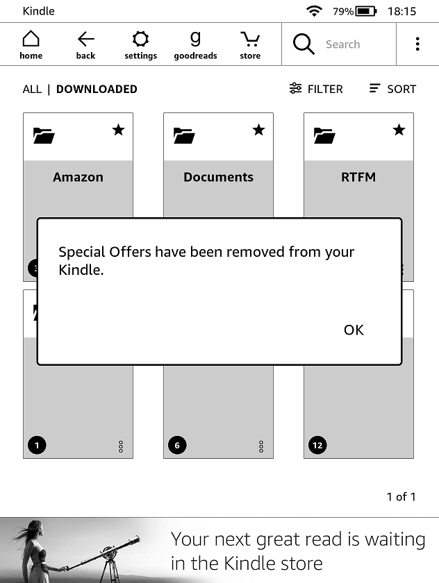 Инструктаж как это делать, на Амазоне есть конечно (за $20), но у меня такой возможности не было. Добрые люди Reddit-а посоветовали обратиться в чат поддержку Амазона, а там уберут, причем бесплатно. И так оно и было. Открыл чат, сказал что хочу убрать Special Offers. Спросили откуда я, и после ответа, сообщили что мол реклама только для США и они мне её отключают. Отключись\подключись к wifi, и всё.