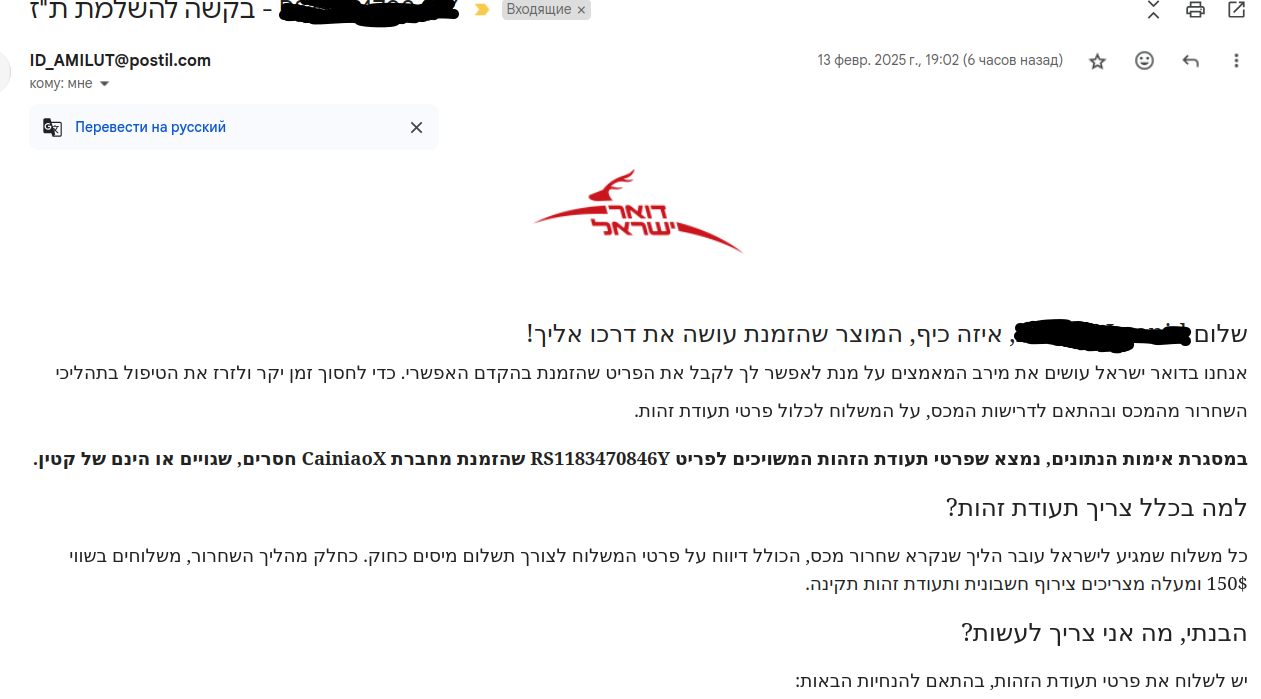 Получил от израильской почты письмо на мыло, что якобы должен сообщить им свой тз. Вроде бы письмо настоящее, не скам/фишинг. Но что, они не знают моего тз? Странно очень. Кто-нибудь получал такое?
